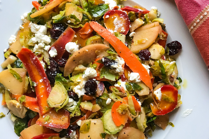 - Prepara gli ingredienti. Lava e asciuga i cavoletti di Bruxelles, elimina la base e tagliali a metà nel senso della lunghezza. Appoggia le metà con il lato tagliato verso il basso e affettale finemente fino a ottenere una consistenza simile al cavolo cappuccio. Pela le carote e, con una mandolina o un coltello, tagliale in strisce larghe circa 0,5 cm. Taglia la mela a metà e poi a fettine sottili.
