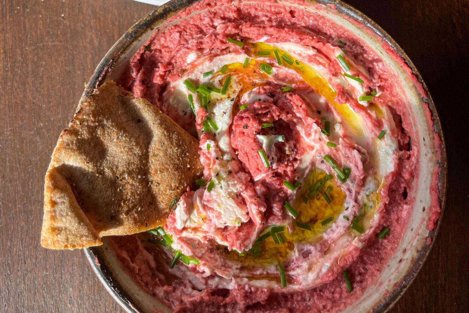 Hummus di barbabietola con crema di caprino montata e chips di pita fatte in casa